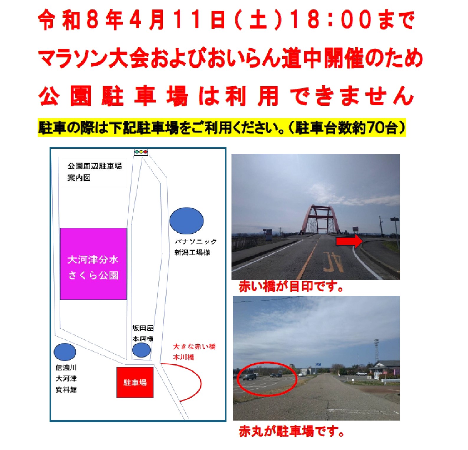 【大河津分水さくら公園 駐車場利用禁止のお知らせ】
